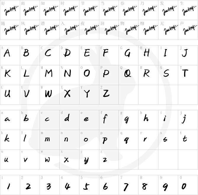 Jackey_HandWrite.ttf is a very beautiful artistic font, Jackey_HandWrite.ttf is widely used in the design and printing of various books and pictures,Jackey_HandWrite.ttf has a strong visual impact,Jackey_HandWrite.ttf is a commonly used font in newspapers, magazines and books, and is used in posters, e-commerce Poster design, store design, logo design, font design and other fields.Jackey_HandWrite.
