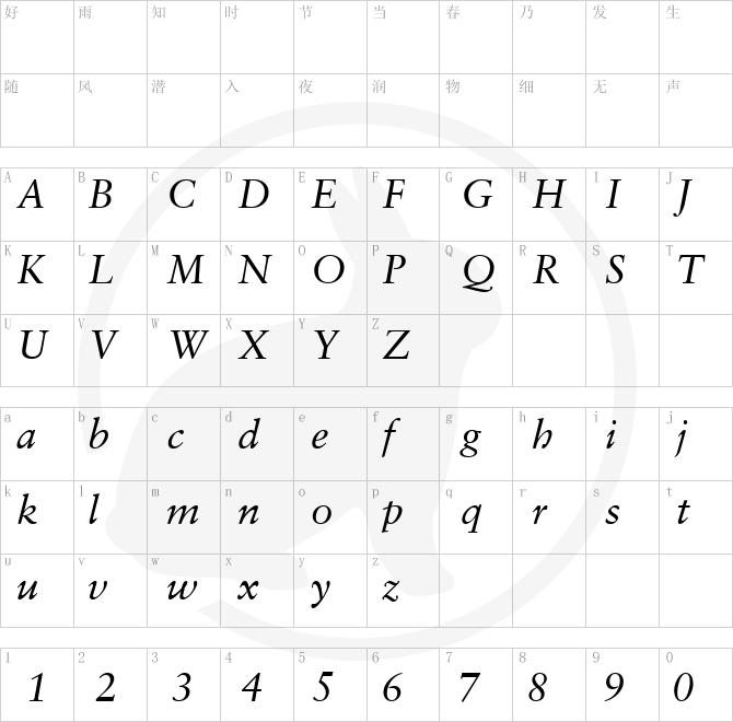 Sabon-LT-Italic.ttf is a very beautiful artistic font, Sabon-LT-Italic.ttf is widely used in the design and printing of various books and pictures,Sabon-LT-Italic.ttf has a strong visual impact,Sabon-LT-Italic.ttf is a commonly used font in newspapers, magazines and books, and is used in posters, e-commerce Poster design, store design, logo design, font design and other fields.Sabon-LT-Italic.