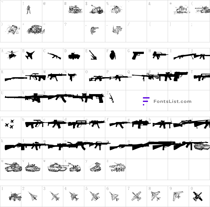 Army-weapons-tfb.ttf is a very beautiful artistic font, Army-weapons-tfb.ttf is widely used in the design and printing of various books and pictures,Army-weapons-tfb.ttf has a strong visual impact,Army-weapons-tfb.ttf is a commonly used font in newspapers, magazines and books, and is used in posters, e-commerce Poster design, store design, logo design, font design and other fields.Army-weapons-tfb.