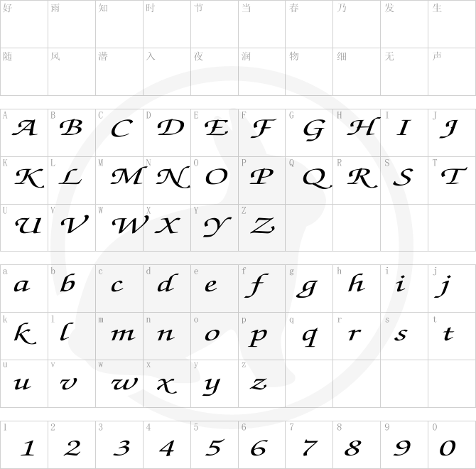 ZapfChancery-MediumItalic-Ex-copy-1-.ttf is a very beautiful artistic font, ZapfChancery-MediumItalic-Ex-copy-1-.ttf is widely used in the design and printing of various books and pictures,ZapfChancery-MediumItalic-Ex-copy-1-.ttf has a strong visual impact,ZapfChancery-MediumItalic-Ex-copy-1-.ttf is a commonly used font in newspapers, magazines and books, and is used in posters, e-commerce Poster design, store design, logo design, font design and other fields.ZapfChancery-MediumItalic-Ex-copy-1-.